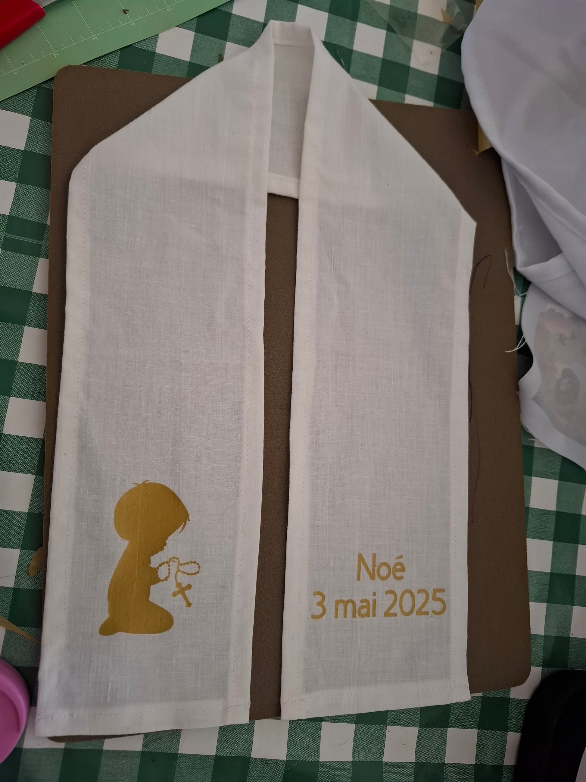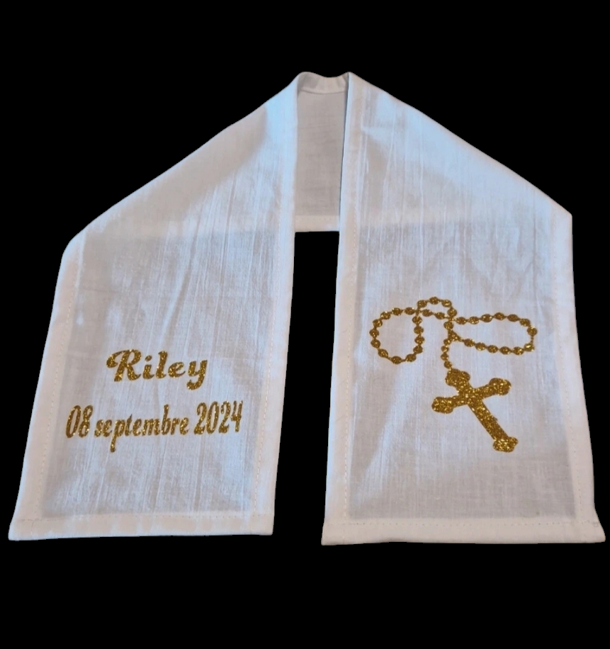 Offrez à votre bébé une touche d'élégance unique pour son baptême avec cette écharpe 100% coton, douce et confortable. Idéale pour cette occasion spéciale, cette écharpe peut être entièrement personnalisée avec le prénom, la date du baptême, ainsi que des motifs de votre choix parmi notre large sélection.